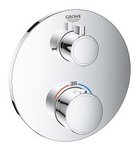 Grohtherm Thermostatic bath tub mixer for 2 outlets with integrated shut off/diverter valve set for final installation for GROHE Rapido SmartBox (35 600) GROHE TurboStat compact cartridge with wax thermoelement GROHE StarLight chrome finish GROHE FastFixation escutcheon with covered shaft sealing and covered fixing metal escutcheon, retroactively 6° adjustable printed hand shower and bath filler symbol GROHE SafeStop safety button at 38°C GROHE SafeStop Plus optional temperature limiter at 43°C or 46°C included GROHE AquaDimmer, integrated shut off/diverter valve flow performance: outlet B = 27 l/min outlet C = 30 l/min without roughing-in set