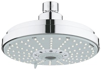 Rainshower Cosmopolitan 160 Head shower 4 sprays Rain, Jet, Pure, Champagne spray Ø 160 mm ball joint with turning angle ± 15° connection thread ½" GROHE DreamSpray perfect spray pattern GROHE StarLight chrome finish SpeedClean anti-lime system suitable for instantaneous heater min. recommended pressure 0.5 bar The head shower is suitable for minimum flow rate of 7.5 l/min and a maximum of 25 l/min (DIN EN 1112). Minimum pressure > 1 bar, maximum 5 bar (DIN EN 1112). recommended for use with Rainshower shower arms